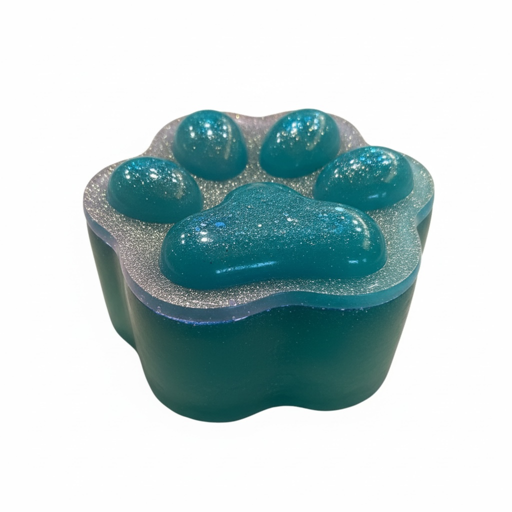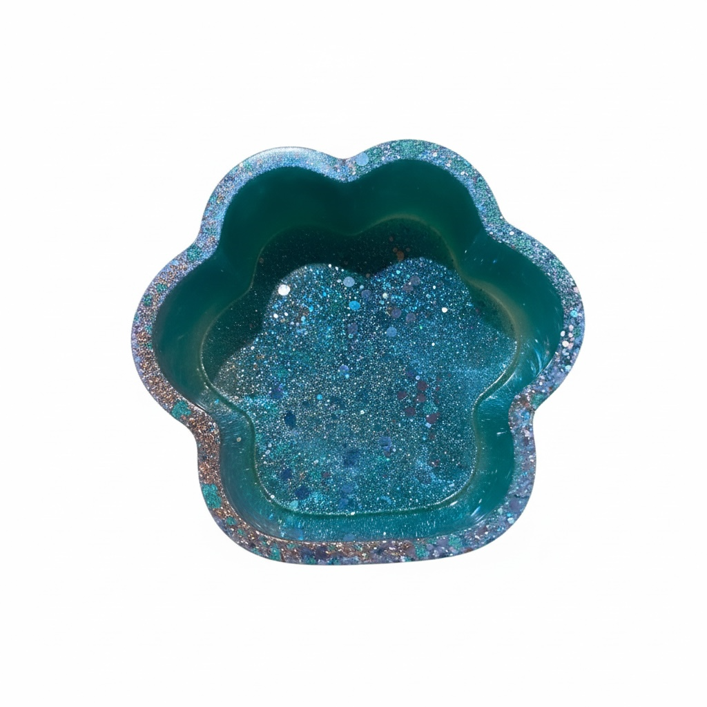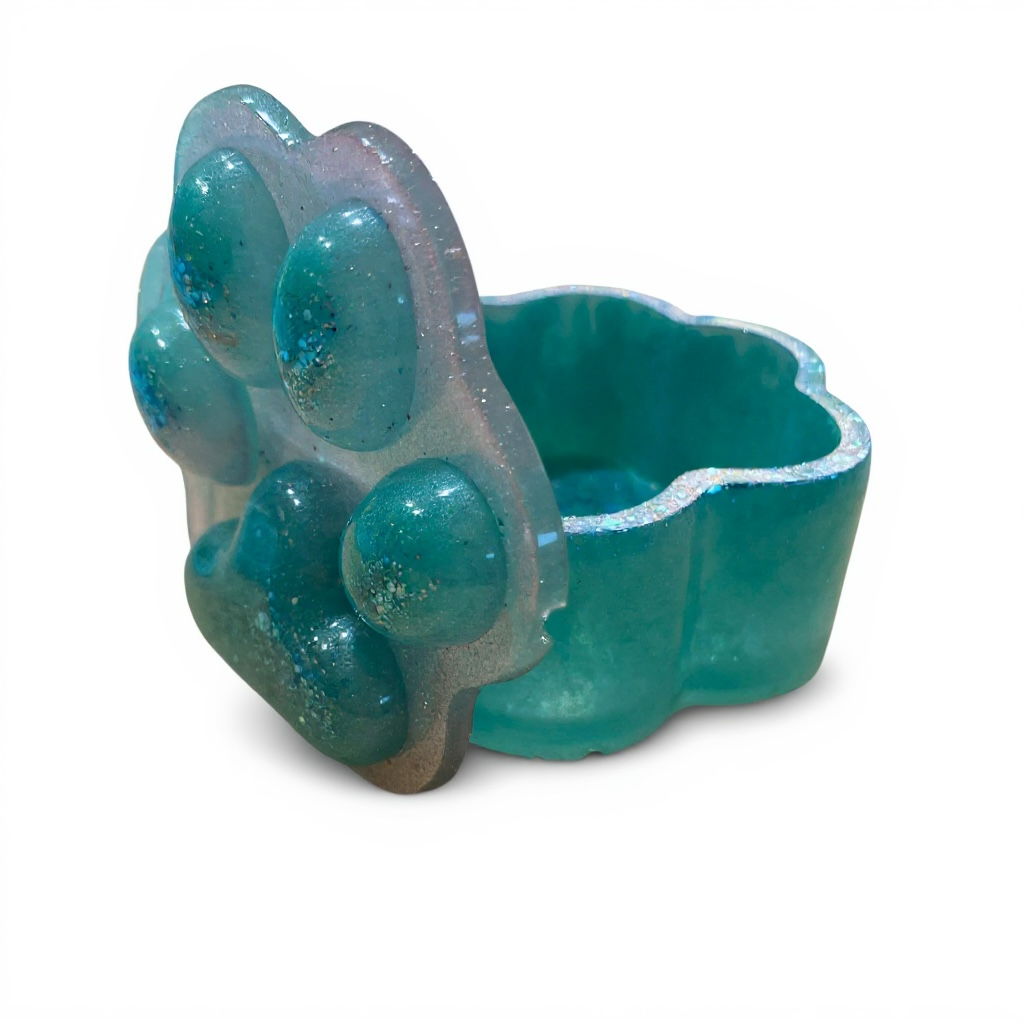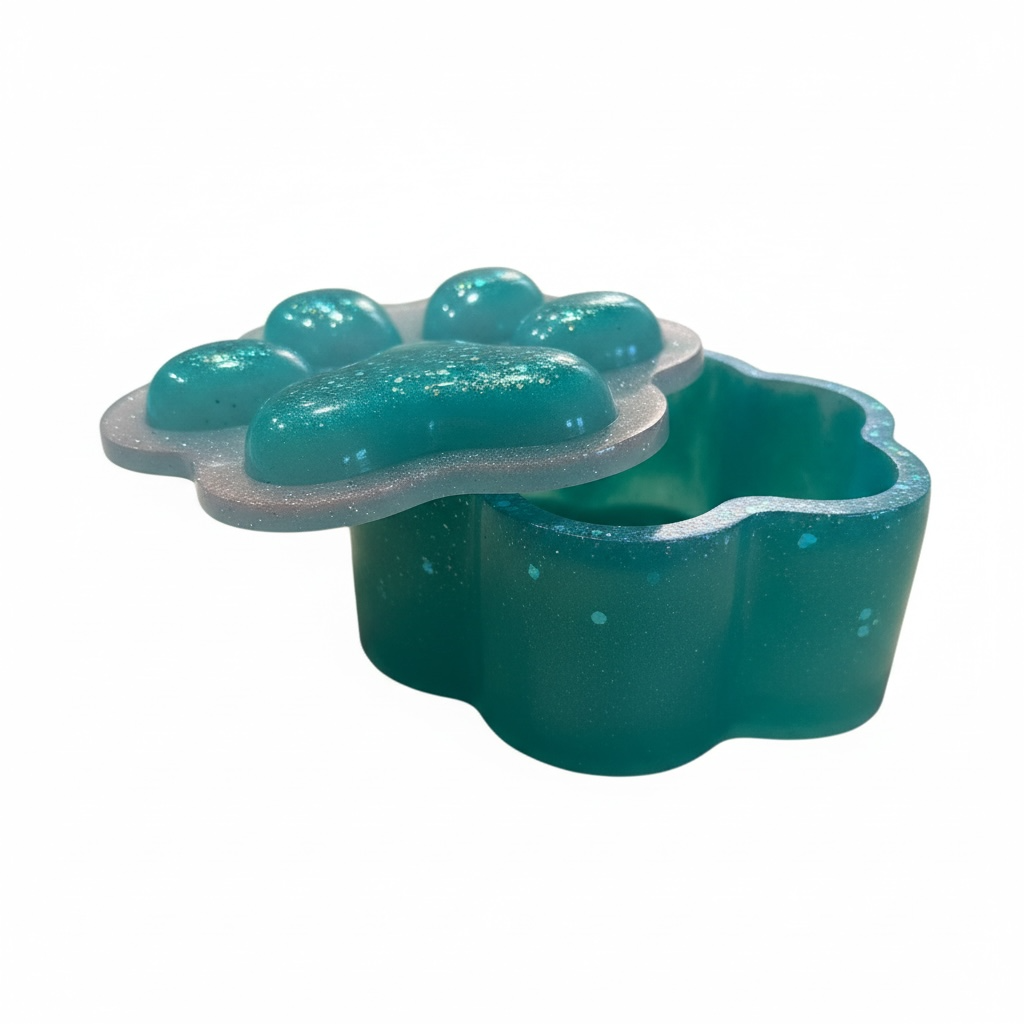 Una piccola scatola in resina fatta a mano, dalla forma morbida e floreale.